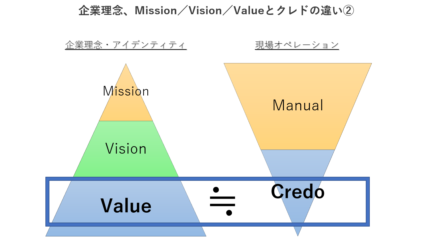 つぎに、企業理念やMission/Vision/Valueとクレドの違いを定義すると、以下のように考えられます(図2)。