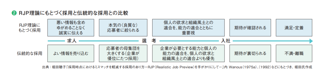 実はこれ、《RJP》という先行研究で明らかになっていることなんです。RJPとは、「Realistic Job Preview」の略で、組織や仕事についてネガティブな情報も含めて誠実に応募者に伝える、現実主義的な情報開示のこと。
