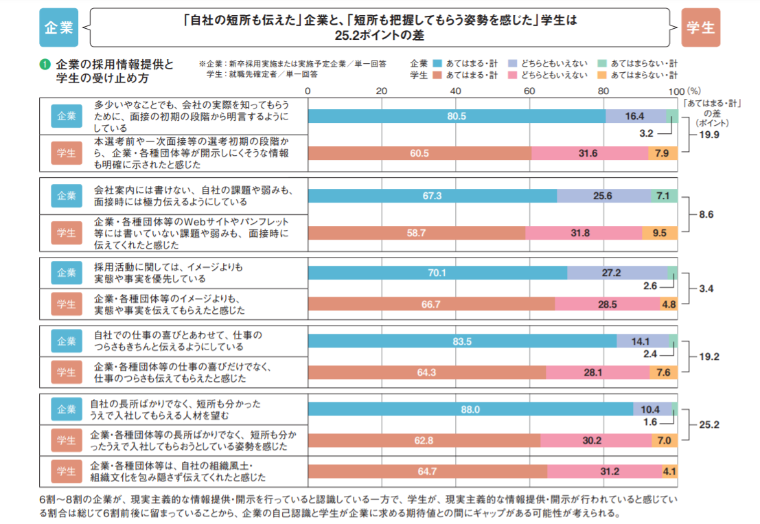 ただし、ここで注意点が。「自社の短所も伝えた」企業と、「短所も把握してもらう姿勢を感じた」学生は、なんと25.2ポイントも差がありました(※2)。