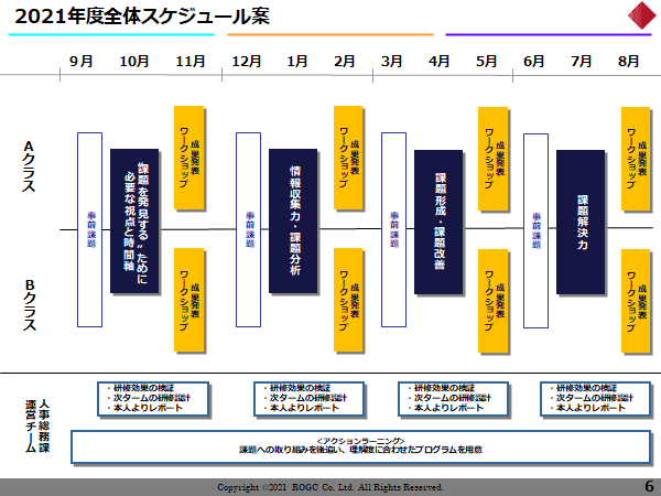 といった、“学習の転移設計”が必須です。本研修では、【事前課題⇒各テーマでの研修⇒レベル分けにしたクラス制での成果発表・ワークショップ】のサイクルを4ターム回していきます。
