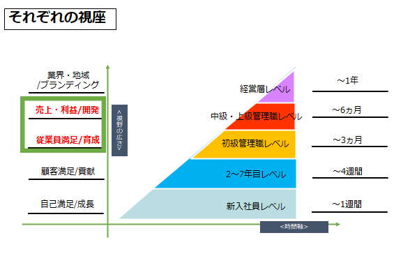 「視野の広さ」で捉えると、初級管理職レベルでは「従業員満足/育成」、中級・上級管理職レベルでは「売上・利益/開発」が求められます。さらに、「時間軸」で捉えると、初級管理職レベルでは「3ヶ月先まで」、中級・上級管理職レベルでは「6ヶ月先まで」見据えることが求められてきます。