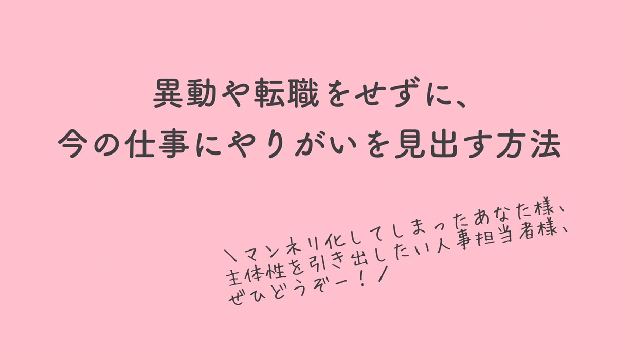 「最近、仕事がマンネリ化してしまって・・・」となんとなく感じているご本人様、「従業員がもっと主体的に仕事に取り組んでもらうには?」とお考えの人事担当者様、ぜひご参考になれば幸いです。